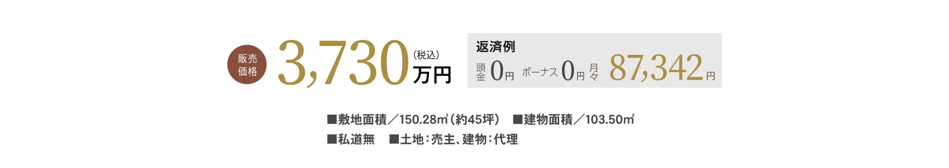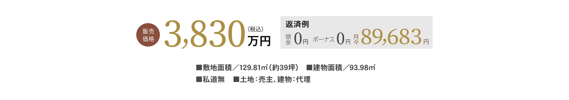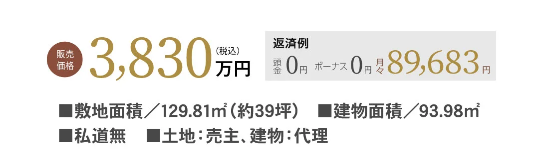 ●所在地/加古川市平岡町土山●交通/JR「土山」駅歩15分●今回販売戸数/4戸●土地129.81㎡(約39坪)〜156.41㎡(約47坪)●建物93.57㎡〜103.50㎡●価格3,490万円〜3,830万円●私道無●第一種住居●1・2号地2025年6月完成済、5・6号地2025年7月完成予定●関西電力・オール電化・公営水道・公共下水●建築確認番号/5号地第HK24-21505号、6号地第HK24-21506号●道路幅員/約6.0m●土地:売主(勝美住宅)、建物1号地売主(パル建設)・2号地売主(パル建設)・5号地売主(明石住建)・6号地売主(明石住建)●紙面中の返済金額計算金利は令和7年7月16日現在の金利です。●金融機関/みなと銀行・40年返済・変動金利0.595%。(基準金利2.875%より2.280%優遇)審査の結果により金利は決定します。お借入金利は、ご契約時点の金利を適用しますので、申し込み時点の金利と異なる場合があります。・融資対象者①20歳以上65歳の誕生日まで且完済時80歳の誕生日まで②返済期間40年以内③団体信用生命保険に加入(保険料銀行負担)④前年度税込年収250万円以上⑤金融機関指定保証会社の保証が条件・融資限度額:価格の110%以内または1億円以内・原則融資対象建物に第一順位抵当権設定・事務手数料:55,000円(税込)・融資手数料:融資金額100万円あたり22,000円(税込)・火災保険付保(保険料はお客様負担)上記の金利優遇、保証料については、お客様の審査内容により変動する可能性があります。紙面の返済計画は40年返済です。別途諸経費要。★掲載物件は令和7年10月13日現在です。契約済の場合はご容赦ください。広告有効期限/令和7年11月30日